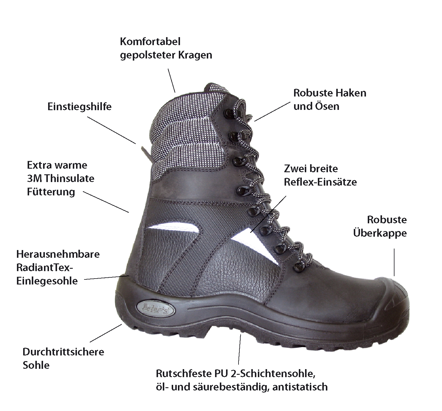 Der gepolsterte Schaftrand, die Einstiegshilfe, sowie die zwei breiten Reflexeinsätze erhöhen den Tragekomfort und die Sichtbarkeit bei Dunkelheit. Die herausnehmbare RadiantTex-Innensohle ist stark isolierend und hält die Kälte zuverlässig fern. Die PU-2-Schichtensohle ist rutschhemmend, öl- und säurebeständig, antistatisch und sorgt mit ihrer Fersendämpfung für ermüdungsfreies Arbeiten – auch bei langen Einsätzen im Freien.
